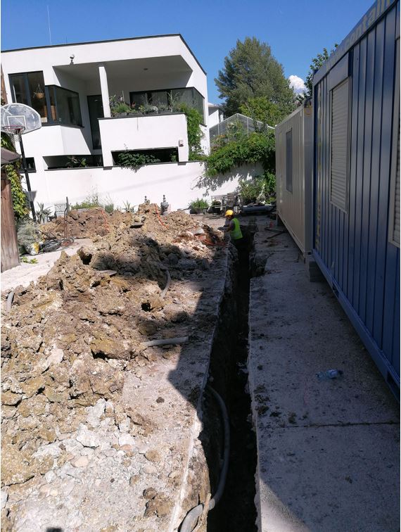 Besonderheit: Der vordere Bestand war die Herausforderung, dem Straßentrakt 2 Stockwerke abzugraben und eine Heizzentrale, Tiefgarage, Kellerabteile, Lagerflächen herzustellen.